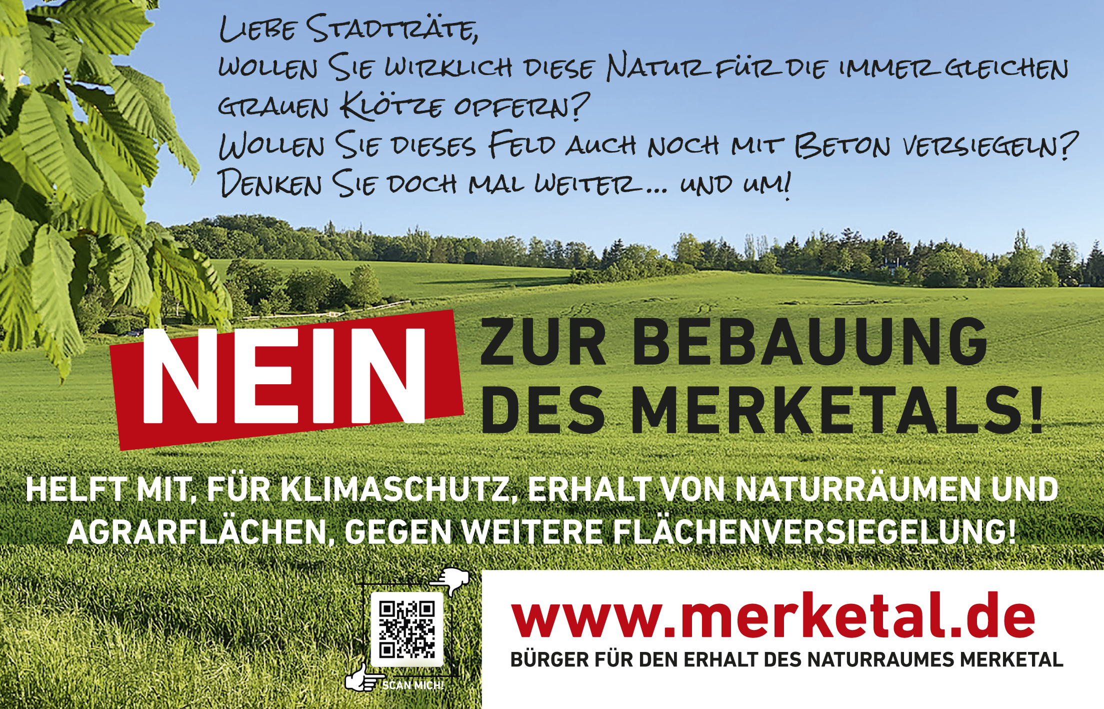 Seit Bekanntwerden der Absicht der Stadt Weimar eine bislang bewirtschaftete Ackerfläche im Merketal an die LEG zu verkaufen, um diese einer späteren Wohnbebauung zuführen zu können, engagiert sich unsere Bürgerinitiative für den Erhalt dieses Naturraumes. Wir sehen den Erhalt des Naturraumes Merketal nicht nur im Interesse der Anwohner sondern als wichtigen Beitrag der Stadt Weimar zu den Themen Klimaschutz und Engagement für eine nachhaltige Zukunft. Diese Meinung teilen mittlerweile mehr als 500 Menschen (siehe unsere Website www.merketal.de); darunter auch Einwohner aus anderen Stadtvierteln Weimars. Es ist keine neue Erkenntnis, muss in diesem Zusammenhang aber nochmals erwähnt werden: Flächenverbrauch und Bodenversiegelung haben erhebliche negative Auswirkungen auf (lokales) Klima, Naturschutz und Wasservorräte.
