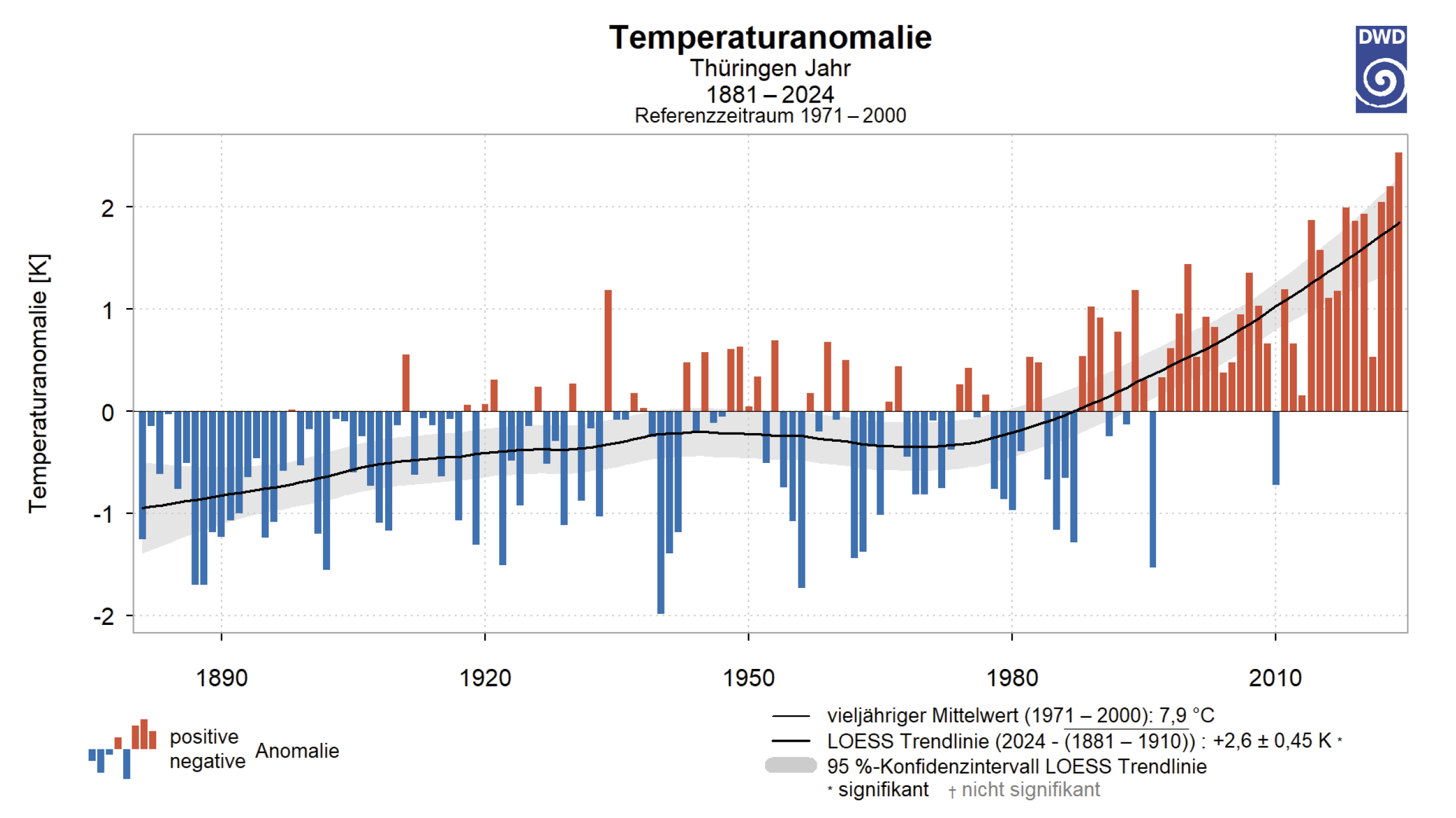 Das unten stehende Schaubild des DWD (Deutscher Wetterdienst) verdeutlicht den rasanten Temperaturanstieg in den letzten Jahren (bis zum Jahr 2024) und unter-streicht, wie realitätsfern die Vorgabe der Stadt Weimar für den Temperaturanstieg bis zum Jahr 2045 mit lediglich plus 1,9 Grad ist.